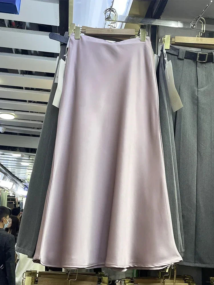 Elegant Women‘s Skirts High Waist Satin Silk Long Skirt Office Ladies Korean Fashion Solid Champagne Fishtail A-line Skirt Women