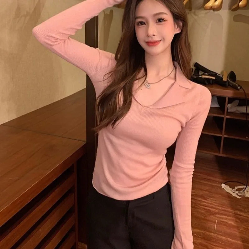 Spring Autumn V-neck Skinny Knitted Shirt Women Pullover Sweater Tops Female Long Sleeve Elastic Slim Knit Bottoming Shirts