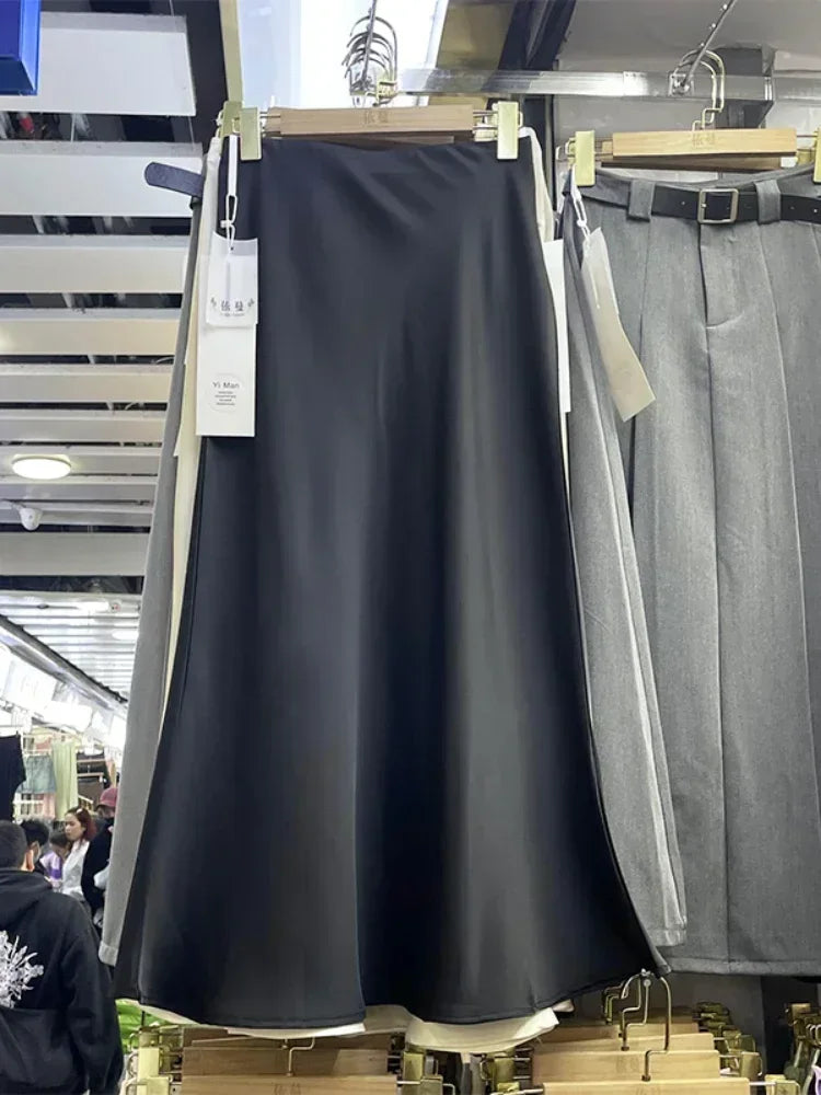 Elegant Women‘s Skirts High Waist Satin Silk Long Skirt Office Ladies Korean Fashion Solid Champagne Fishtail A-line Skirt Women