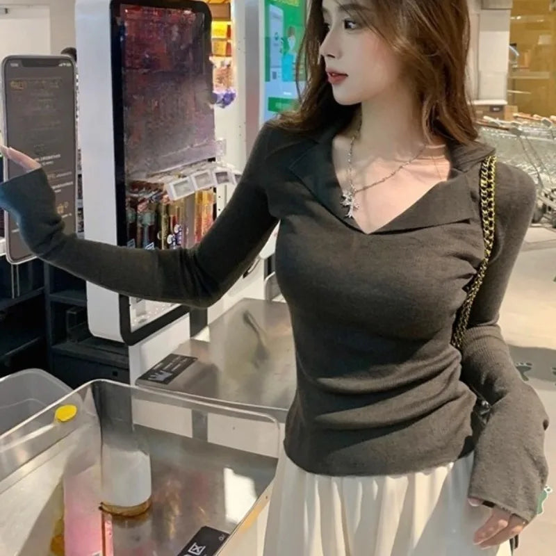 Spring Autumn V-neck Skinny Knitted Shirt Women Pullover Sweater Tops Female Long Sleeve Elastic Slim Knit Bottoming Shirts